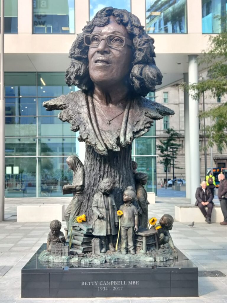 A statue of Betty Campbell was unveiled in front of huge crowds in Central Square Cardiff on 29th September 2021. She was chosen from a BBC Wales poll of Hidden Heroines to be remembered in this way. This statue also has huge importance after the First Minister asked for an audit (an examination) of statues, street and building names following the Black Lives Matters protests last year. The audit found that there were no statues of named individuals of black heritage in outdoor public spaces in Wales. Betty is leading the way once again with her statue now standing proudly in the Capital City.